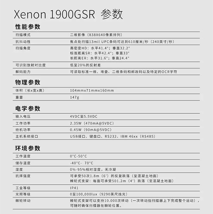 霍尼韋爾Xenon™ 1900 采用第六代二維影像技術(shù),重新定義了手持式條碼掃描器的標(biāo)準(zhǔn)。 采用專為條形碼掃描而特制的傳感器,Xenon 1900在一系列對(duì)二維影像技術(shù)的多功能性有需求的應(yīng)用中均有行業(yè)領(lǐng)先的性能與可靠表現(xiàn)。該款影像掃描器的圖像處理軟件具有先進(jìn)的編輯功能,且能夠上傳和鏈接多種應(yīng)用程序到掃描器。它是一款耐用的手持式掃描器,能夠抵抗嚴(yán)酷的環(huán)境和化學(xué)物質(zhì)的侵蝕。Xenon1900二維影像掃描器是提升您的生產(chǎn)力和工作效率的不二選擇