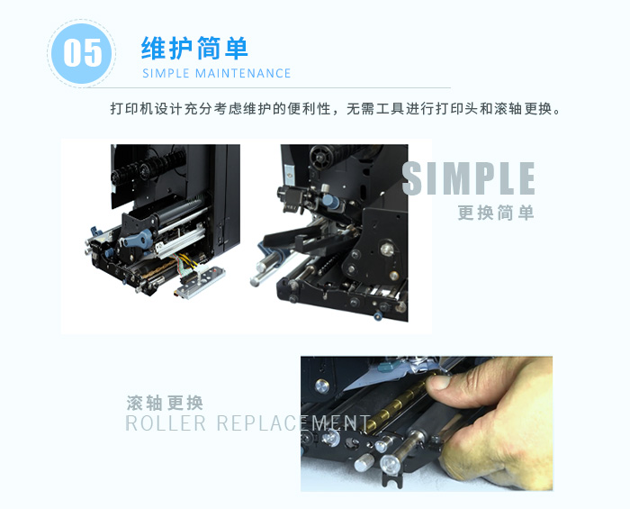 新機型采用了很多新設計方便操作人員去使用,系統方面沿用以確保持續運行。打印頭更換非常簡單緣于無需工具、更長接線且便于檢修。滾軸更換簡單快速緣于環扣設計;傳感器蓋的不粘膠表面設計使工程師或操作人員無需工具就能輕松清潔或更換零部件。