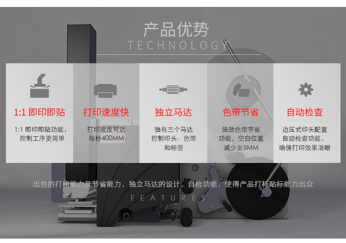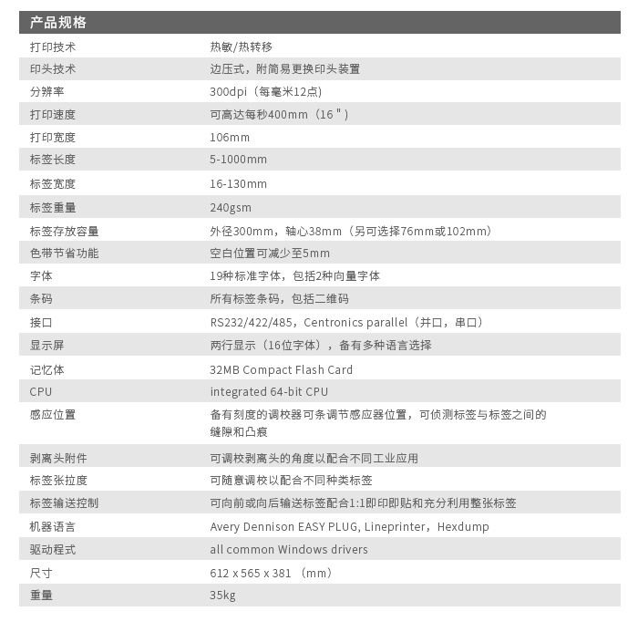 ALX 92x打印貼標機 的1:1 即印即貼功能,讓標簽可以同時進行打印及貼標,直接貼于商品上無可比擬的打印速度!64-bit 處理器可極速下載資料,發揮其1:1 即印即貼功能運作系統能同時處理多過一項指令,即使現在的打印工作還未完成,亦可同時準備下一項打印工作ALX 92x 更換新的打印工作時無需停止現有的工作,其極速打印速度可達每秒400mm,而配合300dpi 高解像度印頭,即使打印細字體或圖像,效果同樣出色多個型號產品設定適用于不同作業系統:除備有左、右手操作類型外,ALX 92x 打印貼標機亦備有其他版本配合不同打印寬度:106mm, 127mm, 160mm可靠的工業用途設計ALX 92x 結構穩固,適合應用于工業環境。