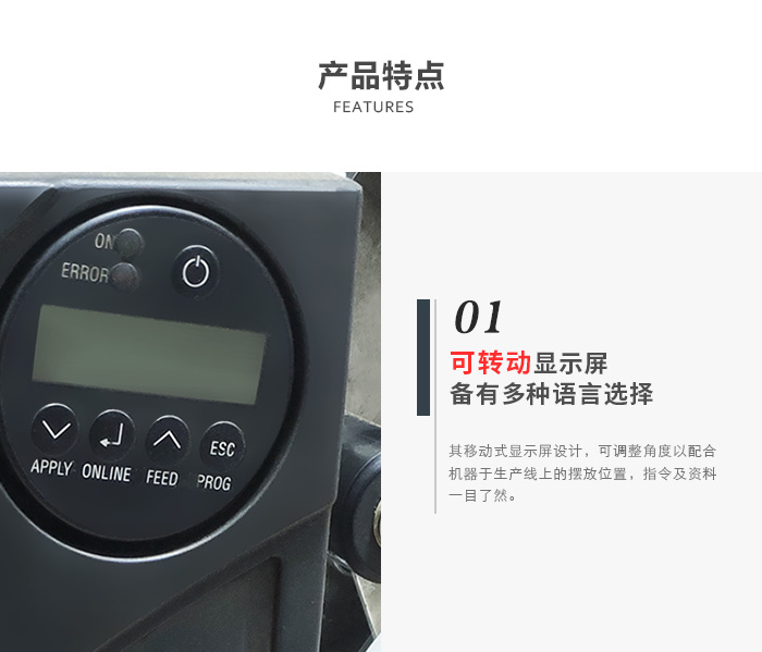 ALX 92x打印貼標機可以在行機時同時進行調較,可以減少壞機停產時間特點顯示屏備有多種語言選擇,可適用于世界不同地區。而其移動式顯示屏設計,可調較角度以配合機器于生產線上的擺放位置,指令及資料一目了然。打印頭簡易更換打印頭設計,無須工具,節省時間。而打印頭于出廠時經精密調較,保證優良的打印質素標準ALX 92x 的基本設定備有19 種標準字體及標準條碼。另可利用Compact Flash Card記憶儲存其他字體及標志感應器ALX 92x 無須停機亦可調較標簽的感應位置。備有刻度的調較器可調節感應器位置,你可根據不同的標簽調較感應器的位置打印頭檢查打即使只有一個打印頭燒點亦可自動檢測得到,保證打印質素。