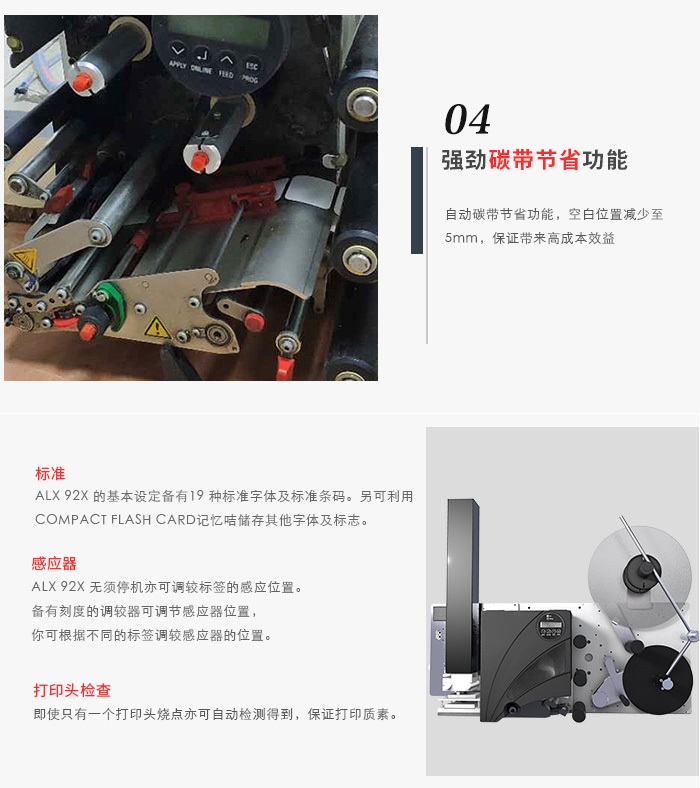 ALX 92x打印貼標機自動碳帶節省功能強勁碳帶節省功能,保證帶來高成本效益RFID 。ALX 打印貼標系統依靠其卓越的打印功能,是打印RFID 標簽的最佳選擇64-bit CPU 可在打印速度高達每秒400mm的情況下,打印出300 dpi 高解像度、清晰印刷品,締造出無懈可撃的打印威力。不只功能卓越,而且亦相當可靠及經濟實用利用以太網(Ethernet)可輕易連接到你現有之資料處理系統為保護芯片及印頭,你可先于打印機設定晶片位置。獨特的邊壓式打印頭設計,于預設的芯片位置或標簽空白的位置會自動提升(如標簽版面已設定于無線收發器附近)
